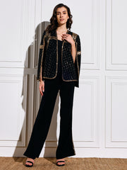Drape yourself in elegance with the Midnight Oro Cape—a true showstopper. Crafted in a premium black crepe fabric, this super-stylish piece is adorned with intricate gold embroidery all over, creating a mesmerizing interplay of light and texture. Dramatic yet timeless, this cape is designed to command attention with every move.
