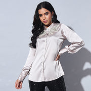 A luxurious satin masterpiece, meticulously hand-embroidered with shimmering white pearls and radiant silver cutdana. A few delicate pearls dangle gracefully, adding an extra touch of sparkle and movement. This exquisite design combines opulence and elegance, making it the perfect choice for those who love to shine with subtle glamour.