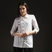 This statement piece features sleek black chains draped elegantly, adding a bold, avant-garde edge to a classic silhouette. Perfect for making a dramatic impression, the Noir Galaxy Chains Shirt merges contemporary style with a touch of celestial allure.