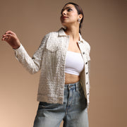 The Ivory Horizon Denim Jacket is a striking piece that commands attention. Crafted in a soft ivory denim, it features dramatic silver hangings on both the front and back, creating a bold, statement-making look. The metallic accents add a touch of modern edge, transforming this classic jacket into a true work of art. Perfect for those who want to turn heads, the Ivory Horizon blends sophisticated design with daring details for a fashion-forward statement.