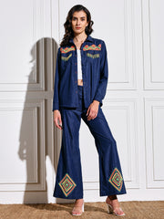 A bold fusion of tradition and modern edge, the Neon Matrix Set is crafted from indigo cotton denim with electric multicolor Aztec embroidery. The shirt features intricate front and back detailing, while the pants showcase a striking embroidered motif at the bottom. Delicate handcrafted tassels add movement, making this set a true statement of vibrant artistry and effortless style.